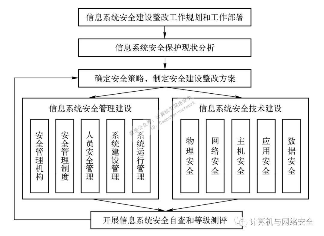 ② 三項(xiàng)重點(diǎn)工作。通過組織開展安全管理制度建設(shè)、技術(shù)措施建設(shè)和等級(jí)測(cè)評(píng)等三項(xiàng)重點(diǎn)工作,落實(shí)制度的各項(xiàng)要求。